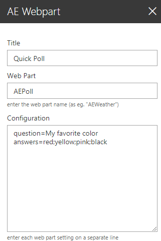 The Quick Poll Web Part allows to quickly publish simple user polls/votings. It allows to define one question and multiple answers. The poll results are displayed as a graphical pie or bar chart.