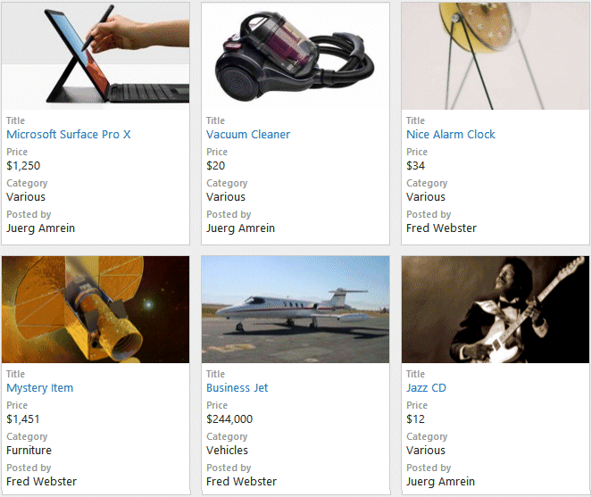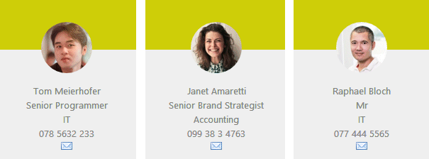 Example: <div style="float:left;margin:7px;width:200px;height:250px;background-image:url('SiteAssets/Backdrop.gif')"> <p style="text-align:center"> <img src="{Attachments}" style="border-radius:50%;height:72px;width:72px;margin-top:31px"> </p> <p style="margin-top:10px;text-align:center;color:gray"> {First Name} {Last Name}<br> {Title}<br> {Department}<br> {Cell Phone}<br> <a href=mailto:{Email>}[mail]</a> </p> </div>
