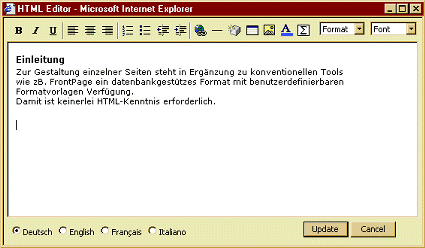 Zur Gestaltung einzelner Seiten steht in Erg�nzung zu konventionellen Tools wie zB. FrontPage ein datenbankgest�tzes Format mit benutzerdefinierbaren Formatvorlagen Verf�gung. Damit ist keinerlei HTML-Kenntnis erforderlich.