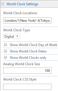 Juerg 10/27/2015 18:24 | Justin, to style the world clock cities, please add the below CSS to the web part's "Options" setting: