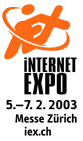 Category: Exhibitions Wednesday, February 5, 2003 to Friday, February 7, 2003 ![]() Vom 5.-7. Februar 2003 findet in der Messe Z�rich zum 7. Mal die iEX Internet Expo statt. Rund 300 Aussteller pr�sentieren ihr aktuelles Angebot. public Author: Site Admin ![]() | ![]() More infos: |